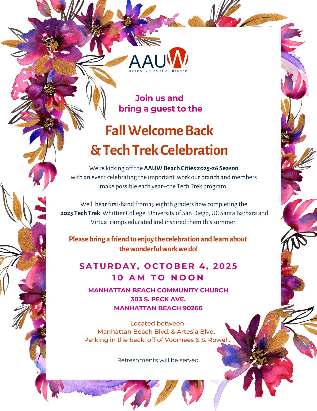 This annual meeting is special because it demonstrates how instrumental your involvement in AAUW Beach Cities is to young women just beginning to dream about and prepare for their futures. You’ll hear first-hand from our 8th grade 2025 Tech Trek campers about what the program means to them and their families.