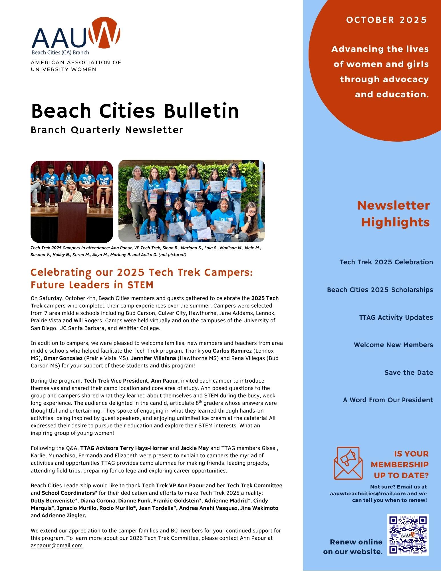 October 2025 newsletter, the Beach Cities Bulletin, which includes a recap and photos from our most recent event, Celebration of 2025 Tech Trek Campers, plus news about what we’ve been up to as a branch and what’s to come!